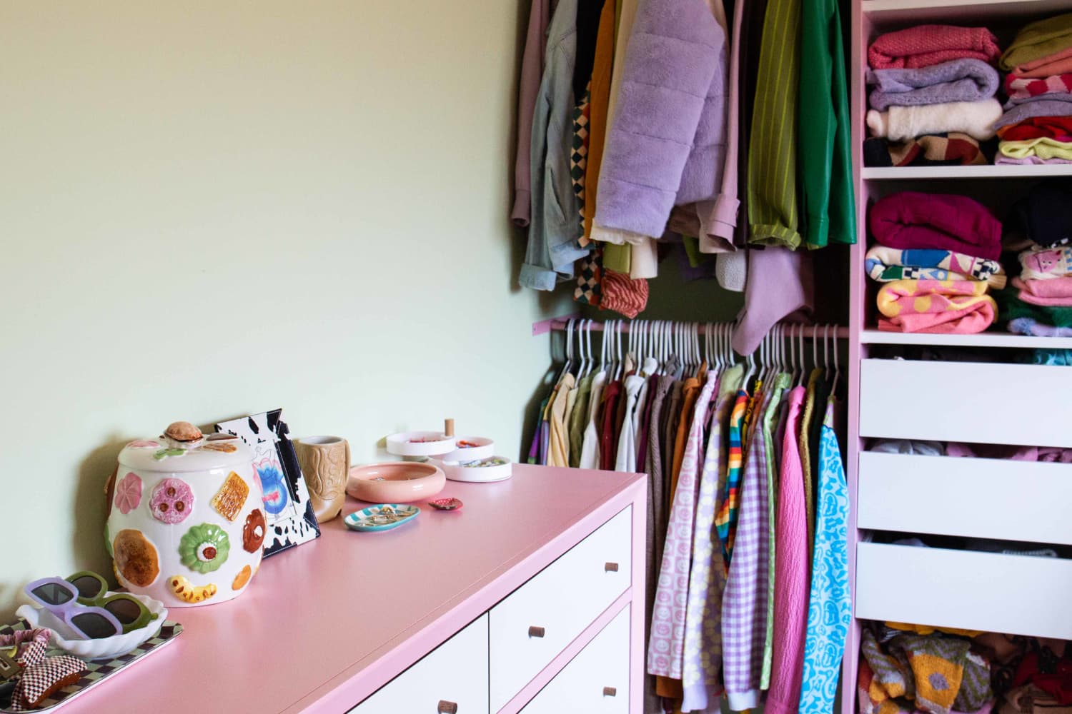 A New York City resident transformed kitchen pantry and cabinets into shoe storage, displaying heels, boots, flats, purses, and sunglasses.
